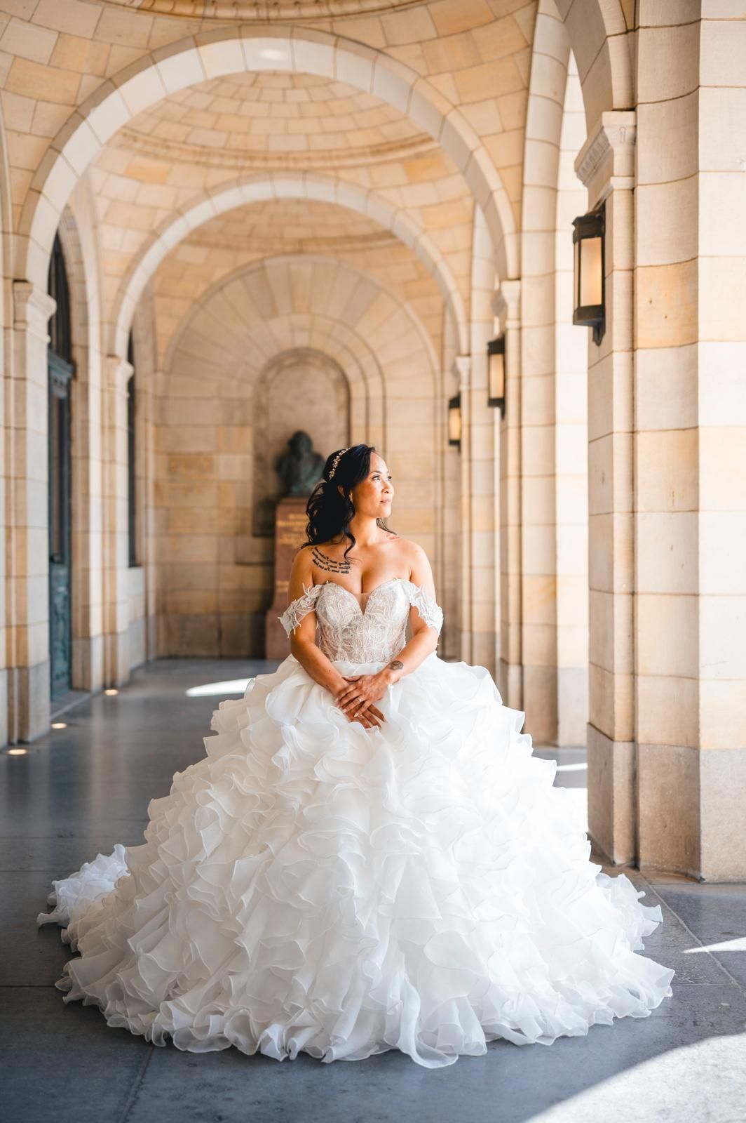 Een perfecte balans tussen zachte elegantie en krachtige uitstraling – precies zoals een bruid zich hoort te voelen op haar grote dag.