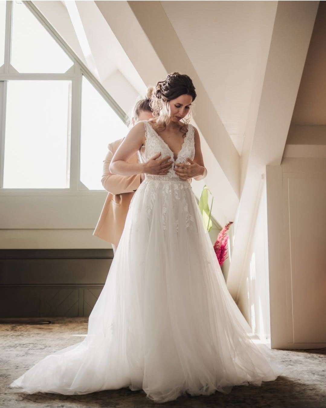 Een bruidslook die niet alleen prachtig is op foto’s, maar ook moeiteloos blijft zitten — van het eerste moment dat je in de spiegel kijkt tot de laatste dans van de avond.